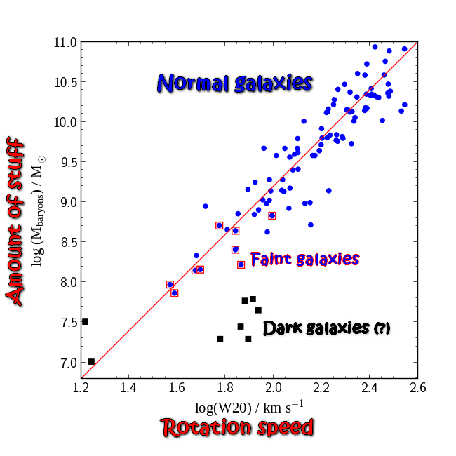 There's a third reason. The Tully-Fisher relation is a very well-established correlation between how fast a galaxy is rotating and how much ordinary matter (gas and stars) it contains. In fact it's so well-established that if you wanted to define a galaxy, you could almost say, "anything that obeys the Tully Fisher relation". While even the faintest (but still optically visible) little smudges we'd found in the Virgo cluster with our survey seemed to obey this relation perfectly, these objects which were apparently totally dark do not.