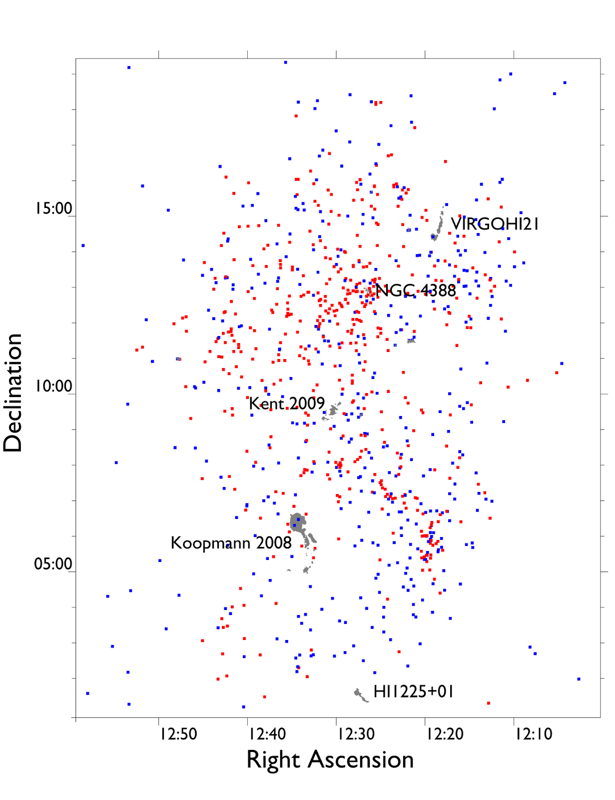Now, since VIRGOHI21 was, at the time, thought to be a really exceptional object, those latter points might be acceptable. A weird galaxy that produces a weird object. OK, fair enough. But now we know there are more such clouds, ones which don't have streams at all. Worse though is the failure of the Duc model to reproduce the velocity gradient - they very sneakily adjust the scales on their figures 2 and 6 (observation and simulation respectively), making it look as though they made something much more similar to the real VIRGOHI21 than they actually did.