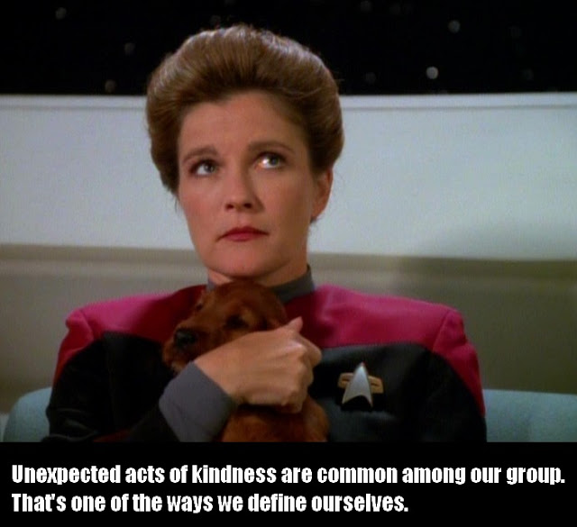 Specific examples of Federation compassion are too numerous to list and can be found in almost every single episode of every series. In essence, whenever things are looking particularly grim, instead of doing something even more grim, someone does something nice, and things start getting better. Perhaps this is something drilled into Federation children from a young age.