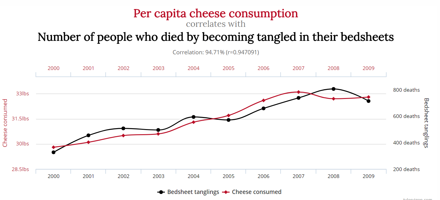 In the case of the cheesy death, I suggest this may be a variant of what's known as p-hacking. If you plot enough parameters against enough other parameters, then you're gonna see a few correlations just by chance alone : weird things crop up in large data sets. Consider how many countries there are are and the range of the years shown, for instance. I'll come back to this later on.