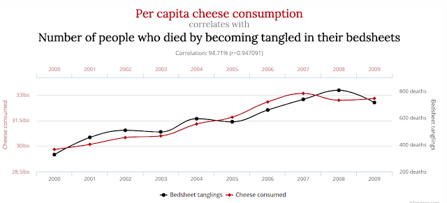 It's also fun to speculate as to what physical connection there could be between these two variables. Does cheese consumption somehow make you feel colder so you're more likely to wrap yourself up in the bedclothes ? Does it just make you stupider and possessed of the urge to stuff a pillow in your face ? Maybe - but look, you don't know what the independent variable is here. It would be equally valid to say that whenever someone dies of becoming entangled in their bedsheets, their friends and family console themselves by eating cheese !