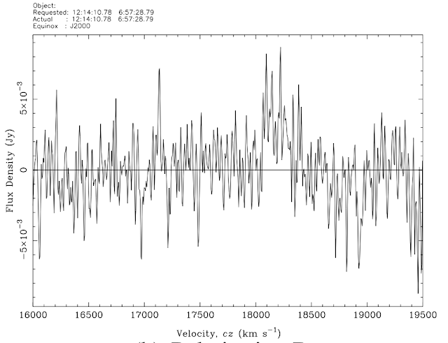 This is one of those potentially really exciting discoveries : a quite strong HI detection with a broad line width, normally indicating rotation (so a high dark matter content) but with no optical counterpart. Very cool ! Except, of course, follow-up observations revealed that this source was spurious. But this is no single-channel spike in the noise. The noise is, alas, not perfectly Gaussian, so for whatever reason features like this appear much more frequently than statistics predict. But the really important point is this : there is absolutely no way to confirm this source other than by follow-up observations. It has no characteristics indicating that it's fake; I've seen weaker sources than this one which turned out to be real. It would be literally impossible to write an algorithm to determine if it's real or not, because it's indistinguishable from real sources. The conclusion is that being objective is not at all the same as being correct. Just because you found something or measured something with an algorithm does not mean that you've done it correctly : it only means that you did so in a repeatable way that didn't depend on your subjective judgement. We'll see more examples of how difficult this can be later on, but it's worth emphasising that (some) people do have an unfortunate tendency to confuse objectivity with correctness.