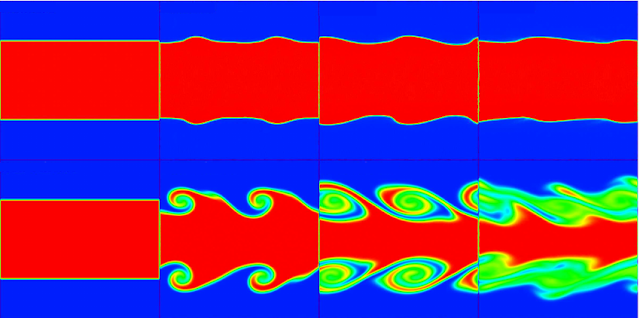 SPH has problems in reproducing these beautiful wave-like whorl structures. Traditional SPH produces just a small, uninteresting-looking bump instead. Confession : younger me thought this was a good thing. Why would you want instabilities ? Surely it's better to have more stable gas ? Of course the problem is that these instabilities are what happen in reality, so if you don't have them, you're changing the way the gas fragments. There are ways to improve this situation but of course they have their own associated penalties.