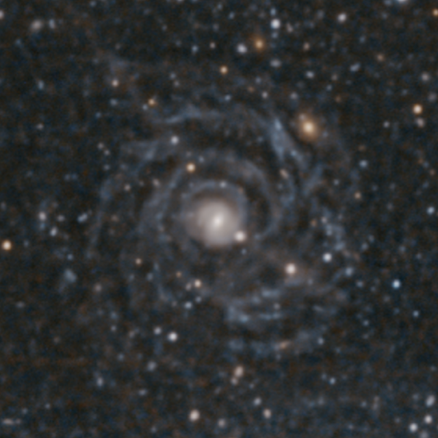 Looks like a boring, ordinary elliptical galaxy. In fact it's anything but. It was discovered quite by accident that this object is just the central core of a much larger LSB spiral :