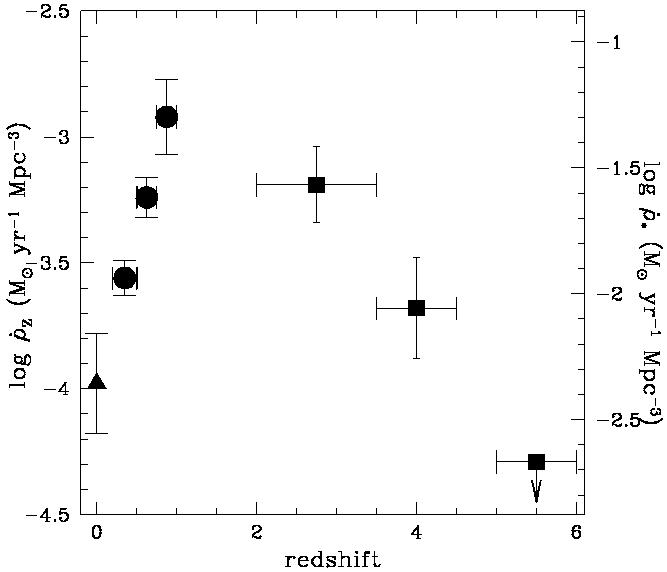 This is the famous "Madau Plot", which shows that star formation rate peaked at a redshift of around one (maybe two according to more recent data, but the basic shape of the curve is the same). Note the logarithmic y-axis : we're talking about very significant differences to today's star formation rates (again, see that review by Dressler from the first lecture). And what it doesn't show is the effect known as downsizing. Star formation rate seems to have peaked for giant galaxies, but not for dwarfs, which tend to show much flatter star formation histories. It's as though giant galaxies assembled themselves first and dwarfs more slowly, in direct contradiction to the predictions of the standard model. Though personally I suspect this may be an effect of converting the gas into stars at different rates rather than truly how the galaxies were assembled.