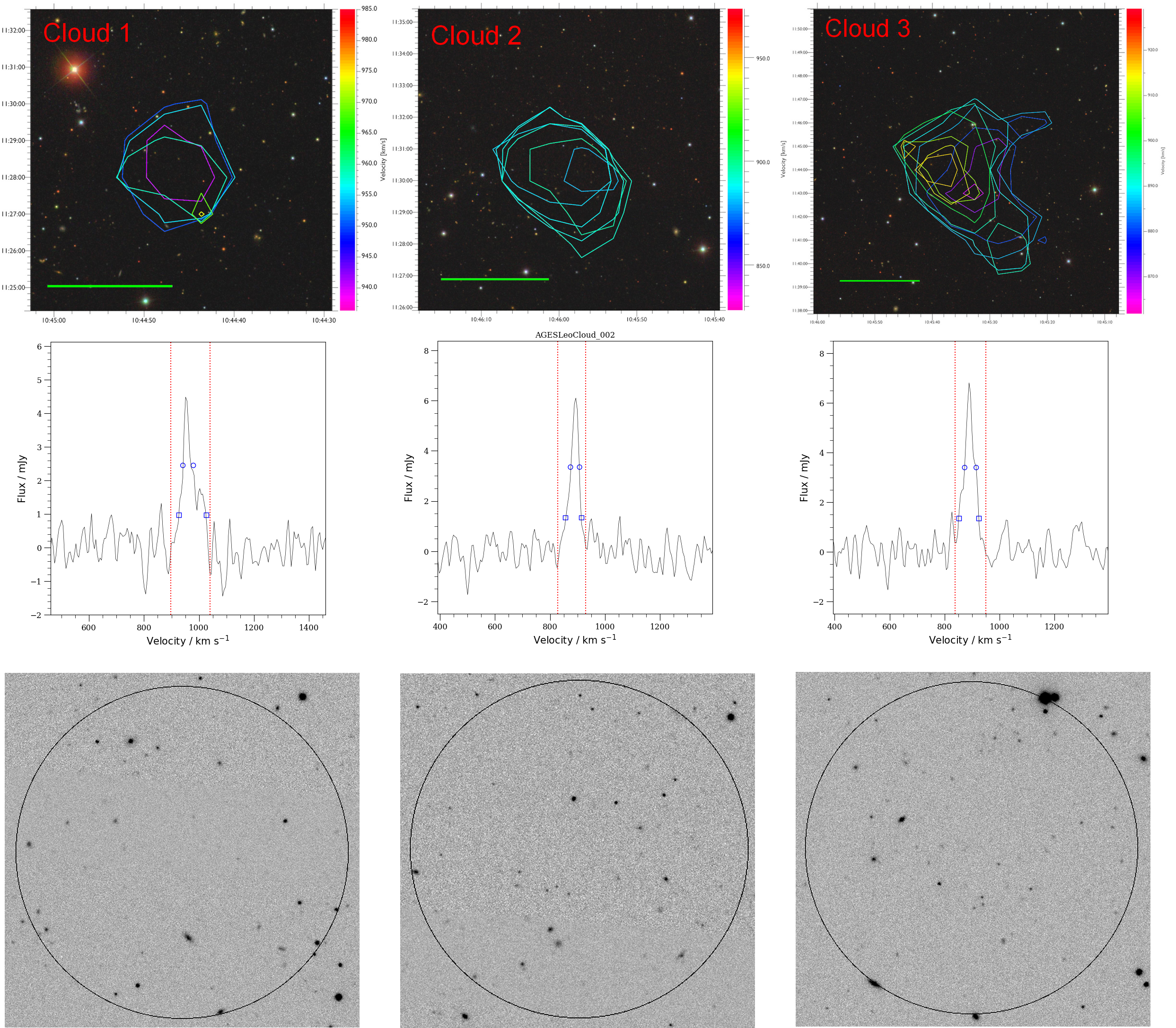 The top row shows the contours on a pretty-picture optical view, the middle row shows the spectra, and the bottom row shows the optical view in a boring greyscale colour scheme that more clearly shows there's nothing there (with one exception).