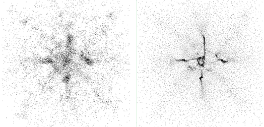 Fragmentation of the collapsing dark matter (left) and gas (right). Both images are about 85 kpc across (280,000 light years).