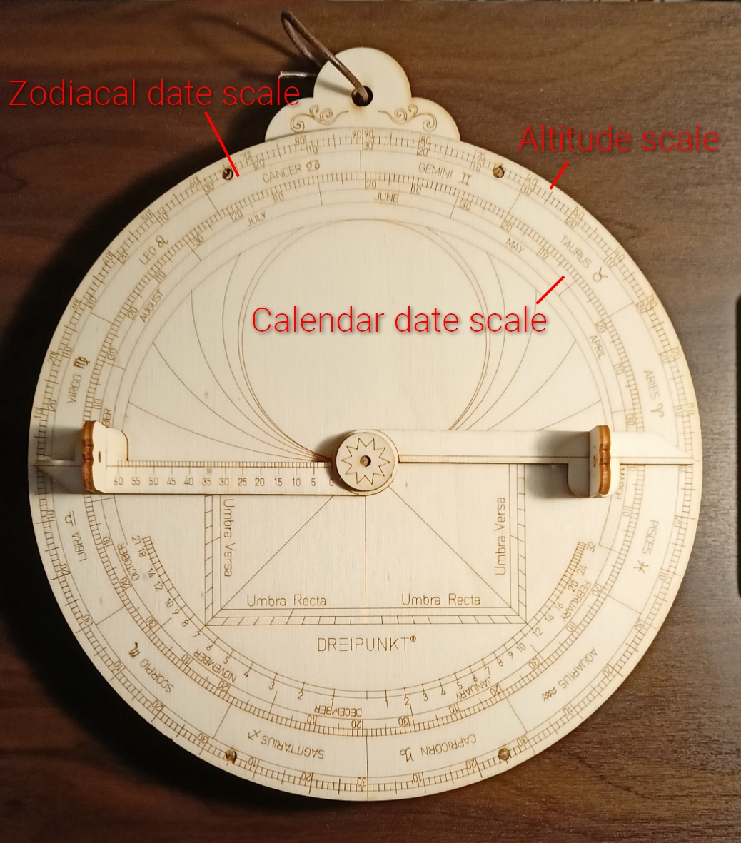 The version that I have is from Dreipunkt and is definitely nice to look at, wooden materials notwithstanding – though why their deluxe versions are so outrageously expensive is beyond me. Unfortunately the instructions that come with it are limited to a 4–page guide, including the assembly instructions (oh, and and a tiny quickstart card for some reason). So, this required quite a lot of Google searching on my part, because the astrolabe community is apparently an oxymoron. But I won't bore you with the narrative. Instead, let's get right down to business by describing how to actually use the bloody thing.